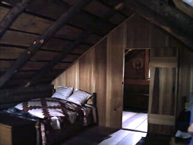 In the main room, there is a table setup with plates ready to serve dinner. Small windows and a fireplace with utensils that they used to cook are shown. There are two bedrooms in this first floor. It was on the second floor where the young Joseph saw the angel and conversed with him until morning.