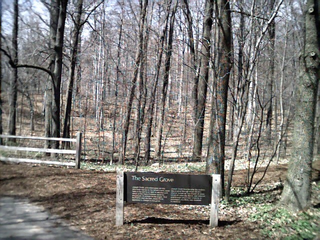 Less than 300 meters away from the log cabin, a sign showed me that I arrived to the Sacred Grove. This is a very quiet place with thin wood trees and scarce vegetation. This is the place where Joseph had the first vision when he was only 14 years old.